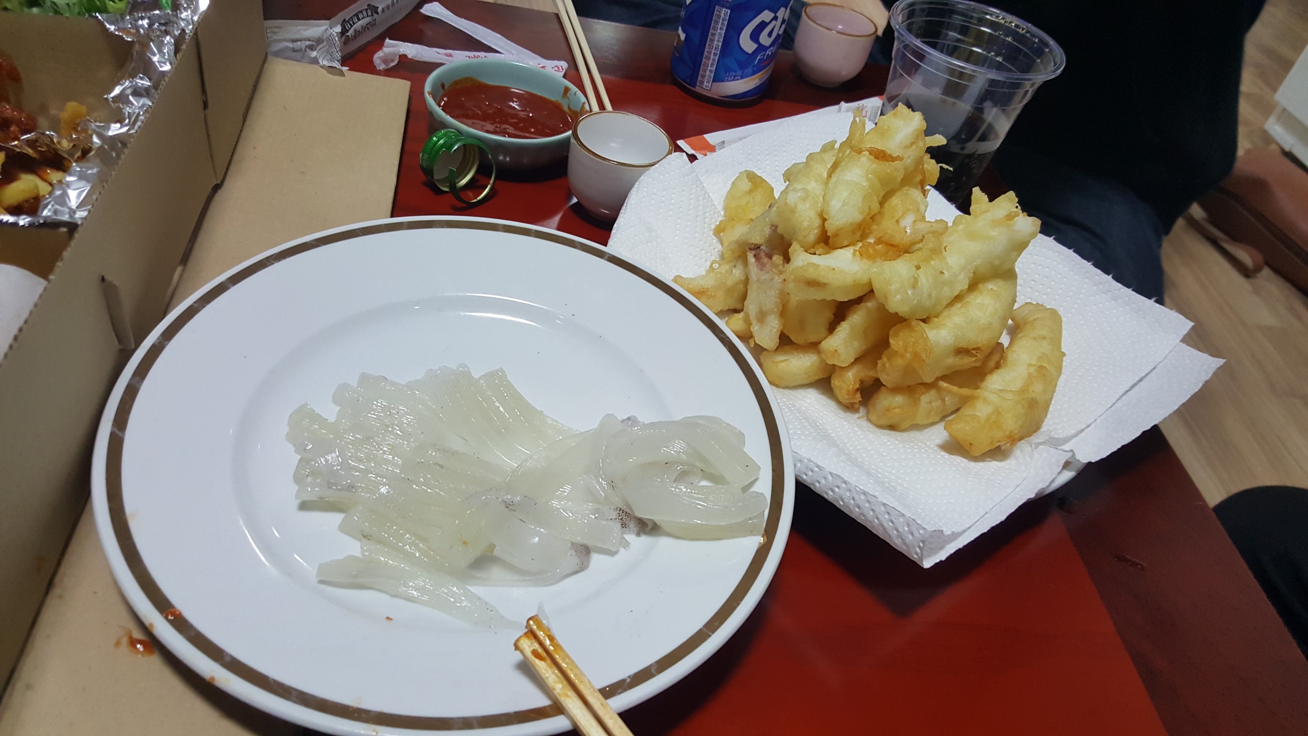 무늬 오징어 회와 통닭이라