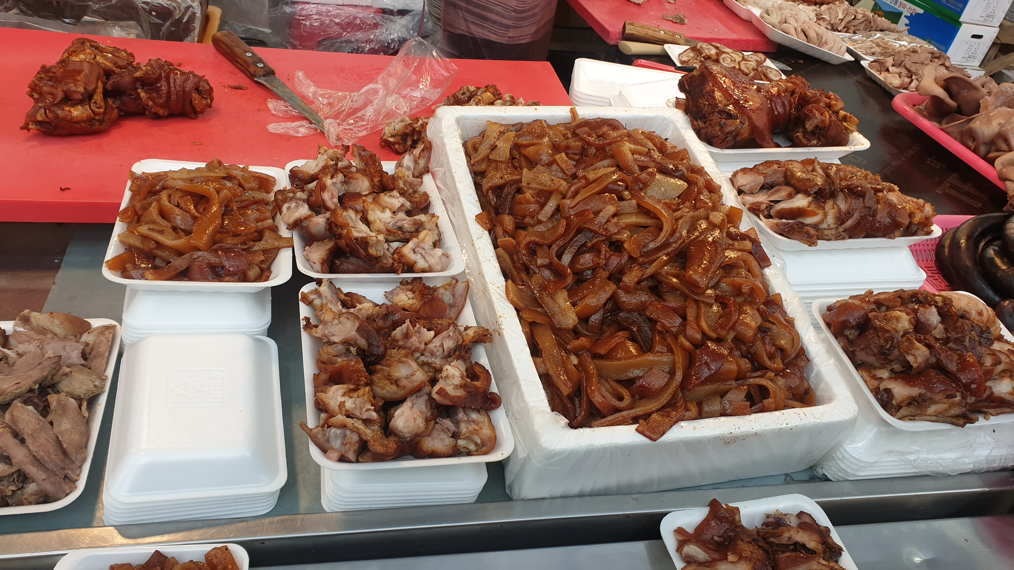 제주도 동문 시장안에 위치한 흑돼지 족발 전문 포장집 - 부산 식육 축산물 공판장 -